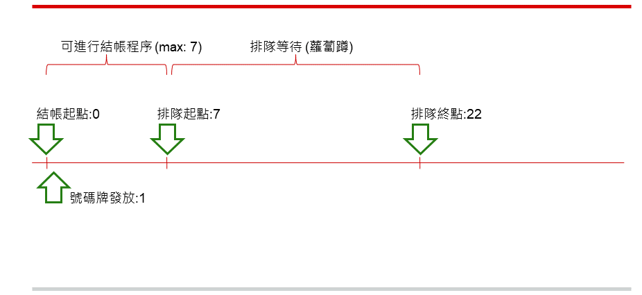 - 排隊的過程必須提供明確的 feedback, 必須讓使用者知道目前狀態 (是否能開始進入結帳),也必須告知順位 (前面還排幾位)。若能搭配平均處理速度的統計數據的話,就能進一步預估等候時間。
