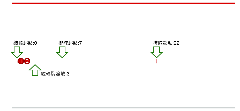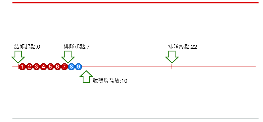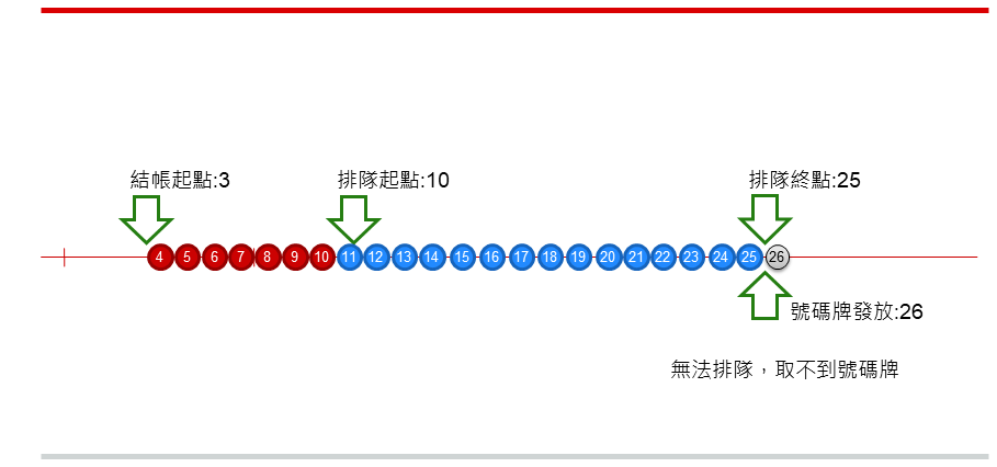 拿到 8 ~ 21 號的使用者,必須在外面排隊稍後 (藍色)