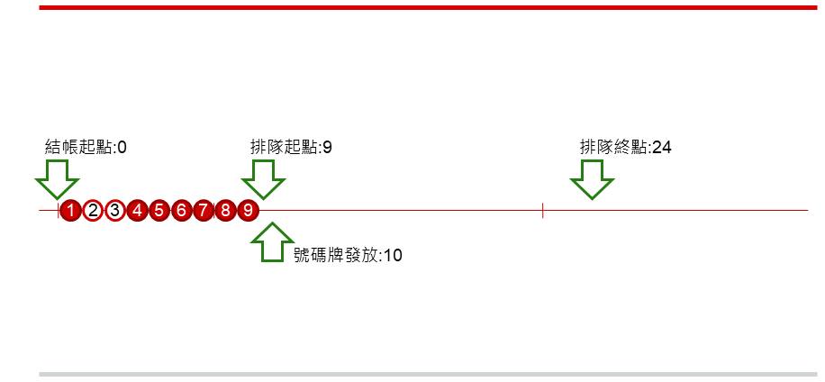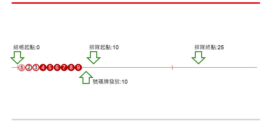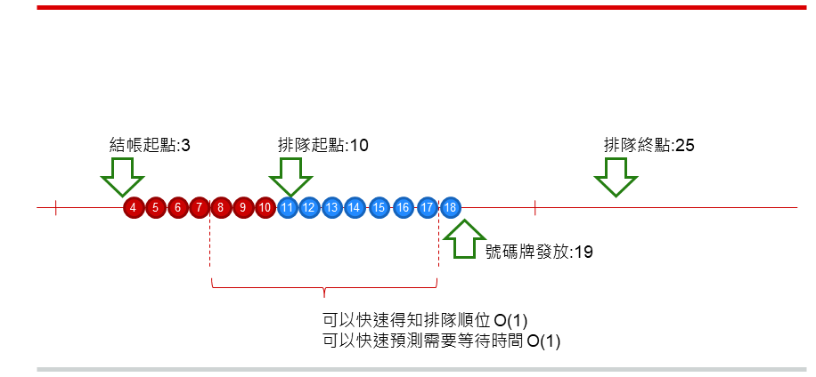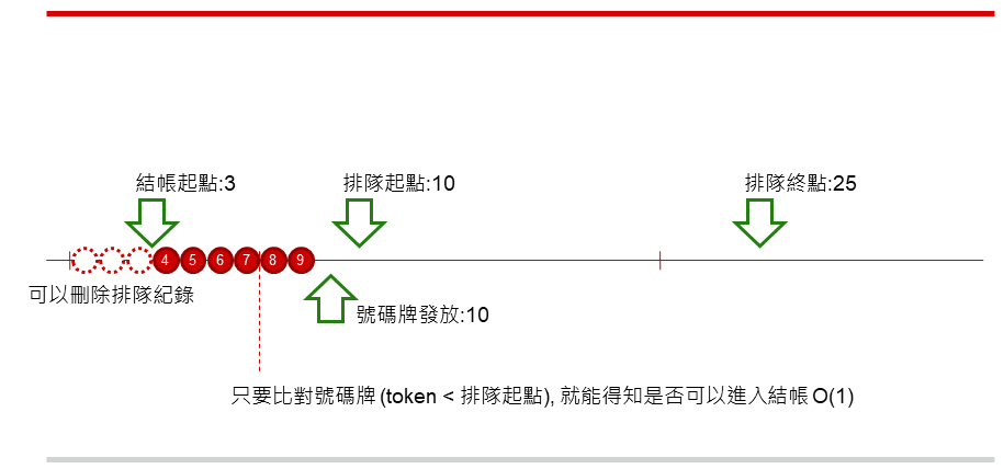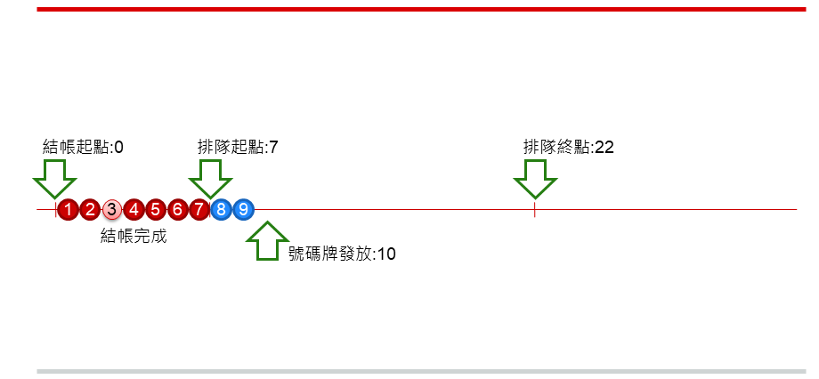 結帳過程需要一些時間,從使用者起身去櫃檯付款,直到服務生清理完這座位後,這個位子才能空出來繼續服務。這過程結束後,還在排隊的使用者就可以再放一位進來店內用餐了。因此座位清理好這瞬間,整個隊伍的狀態應該變成上圖所示。紅色空心的數字代表這位使用者已經離開,不過號碼機不會發放重複的 token, 因此 3 號不會從圖上移除,但是它已經不占位子了,替代作法是把 [排隊起點] 往後移一位,下一位使用者就符合能進入用餐的條件了,下一秒這位使用者在確認能否用餐時就會通過,就能進來店面用餐。