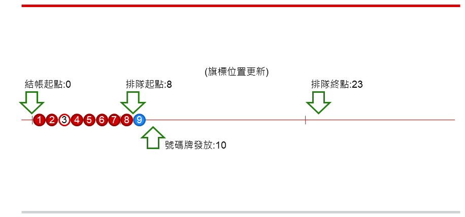 這時,拿到 token(8), token(9) 兩張號碼牌的使用者,因為他的數字比 [排隊起點] 大,因此必須在櫃檯那邊開始排隊了 (藍色)。