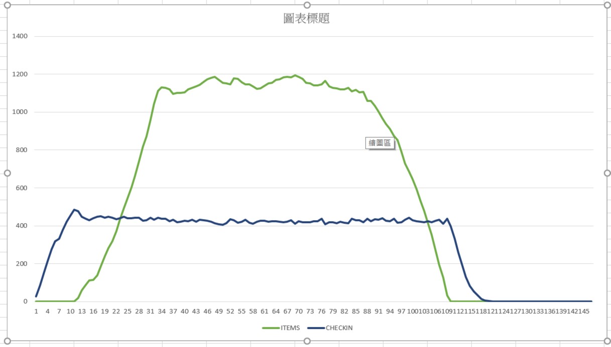 另外,加上隊伍的四個指標 (號碼機、結帳起點、排隊起點、排隊終點),如果都納入這個 csv 匯出清單內,我就有個模擬過程的監控數據了。善用 EXCEL 可以讓我用最輕鬆的方式變成統計圖表。我完全可以靠一個人的人力,完成監控方式的 POC, 將來跟開發團隊溝通會容易的許多。