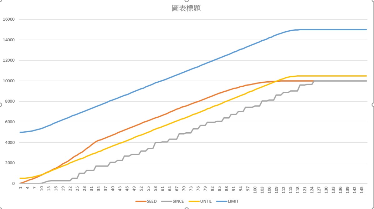 再來看另一組數據,這次我把隊伍的四個指標都秀出來。號碼機(紅),結帳起點(灰),排隊起點(黃),排隊終點(藍)… 想像一下,這四個數值隨著時間不斷的往右移,號碼機不斷地發出新的號碼牌。中間大部分的情況,號碼牌發放的位置都超過排隊起點,代表這家店都維持再客滿的狀態。值到後段號碼牌發放變慢了,逐步被黃線超越,這就代表店面內開始有座位空出來了。值到要結束營業為止,號碼牌跟結帳起點重疊了,代表所有領了牌子的客人都已經結帳完畢了,這家店這時已經沒有半個客人了。