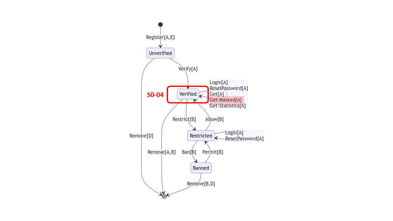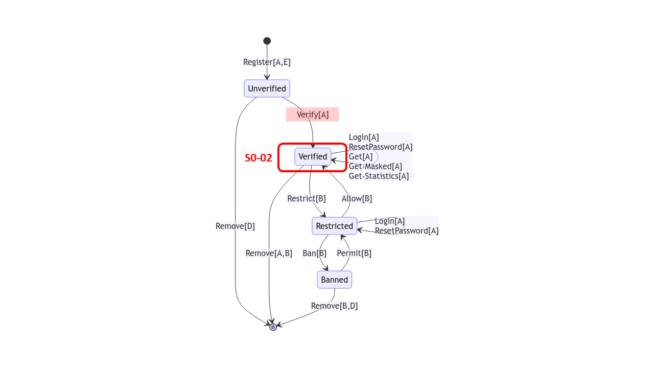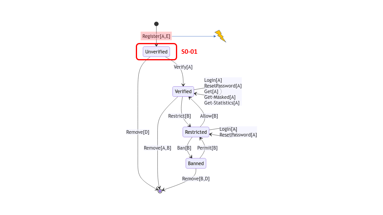 初始狀態是會員資料尚未建立的情況,因此這動作前的狀態應該是 created, 按照情境表的標示應該走 register 這操作,並且會到達完成狀態 unverified,操作的對象是 A-會員本人。從狀態機來看,的確存在這條路徑,並且角色也都符合,這步驟驗證通過。