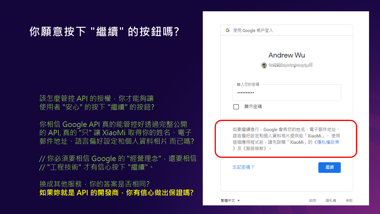 這一連串問題,如果你都沒想過的話,那現在是時候了。有些人對於資訊安全是敏感的,資訊安全除了技術上的考量之外 (有沒有加密,有沒有遮罩等等),另一部分也是你對開發者的信任 (這公司取得我的個資是否會拿去濫用?)。這畫面上的內容,代表徵求授權的廠商 (XiaoMi) 想要取得你選擇認證的廠商 (Google) 上面存放的個人資訊,而 Google 接到這請求,要回應 access token 給 XiaoMi 之前,必須先取得你的確認。