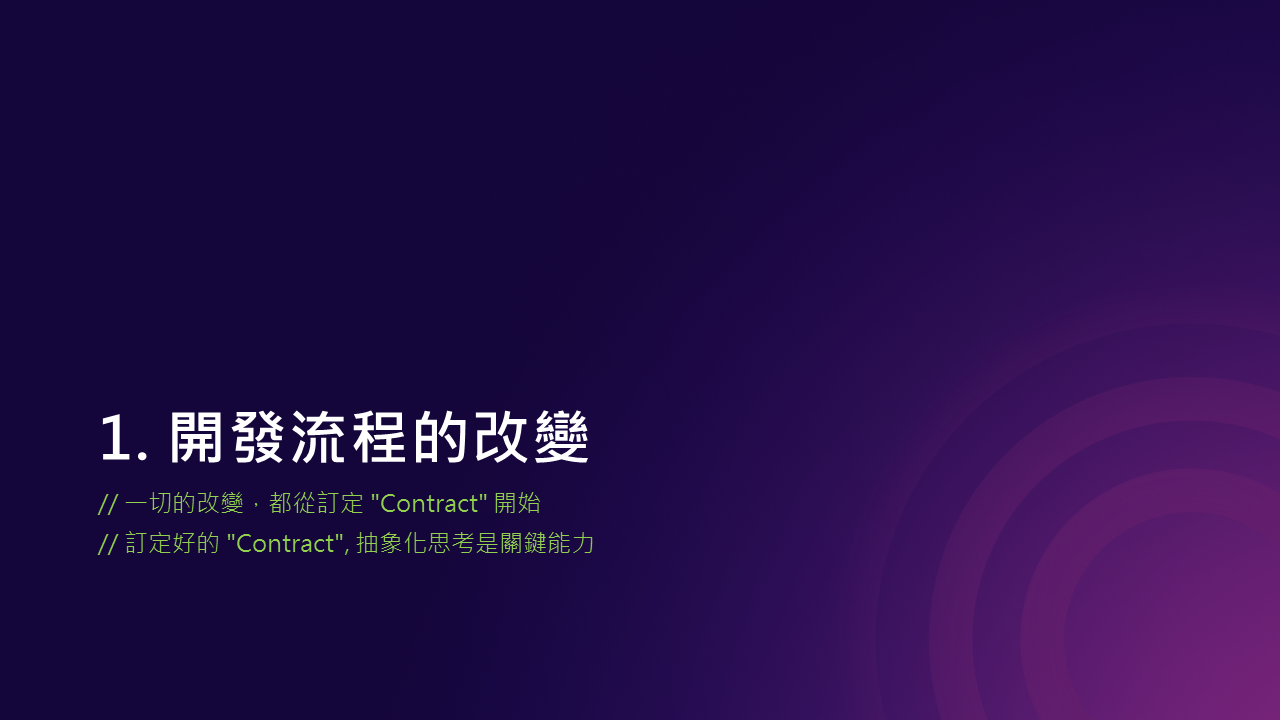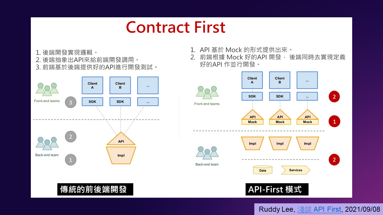 而右半部,說明的就是 API-First 的模式,或是用我更習慣的用語: Contract First, 你先訂好 “Contract”,並且花一點時間確定 Contract 能夠運作,定案下來後前後端就按照合約,各自進行開發,最後再合併一起進行整合測試的過程,就是所謂的 Contract First.