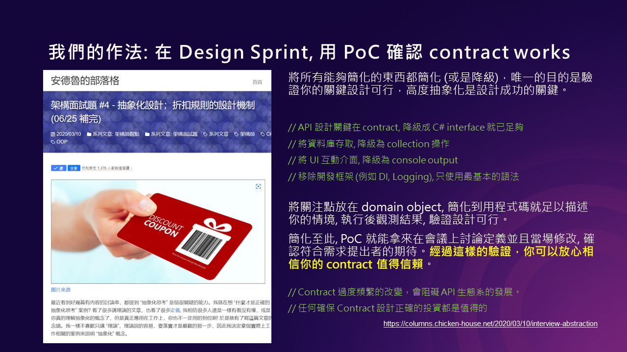 我先不急著探討 “好” 或 “不好” 的問題,那包含主觀的成分在內;我先探討你的設計 “可行性” 有多高,這個比較基本。無法使用的設計,再好都沒用… 最理想的方式,就是直接拿實際案例來沙盤推演。如果光是在架構圖上面標示,就足以拿來驗證情境,那你就有機會做到前面講的: 設計好 contract 就能同步驗證、前後端開發、QA 等等階段同時進行的工作流程了。