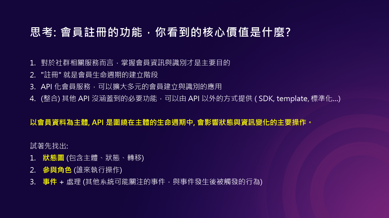 - 抓出主體 (Entity),按照主體的資料 CRUD + 其他特性 (例如這次案例的會員資料,除了 CRUD 之外還有存取未遮罩個資、存取統計資料的授權)。