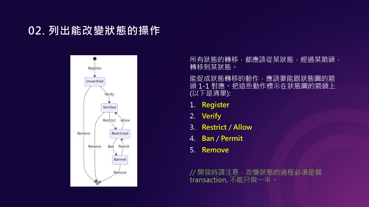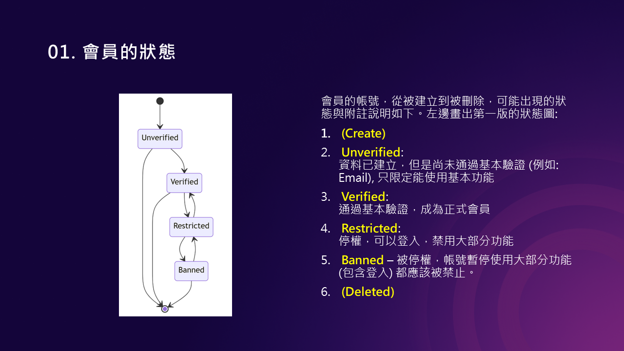 "final-state": "create | unverified | verified | restricted | banned | deleted", // 所有可能的狀態,包含起始與結束狀態