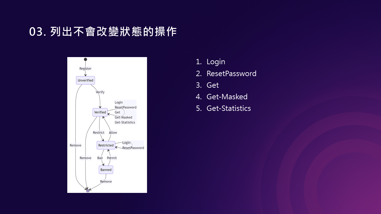 "origin-state": "create | unverified | verified | restricted | banned | deleted", // 所有可能的狀態,包含起始與結束狀態