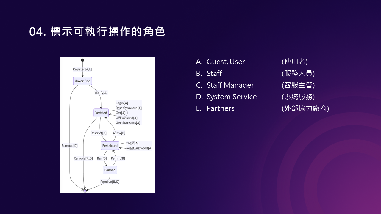 ( “會員本人” 可以執行的異動), STAFF (服務人員可以執行的異動), ADMIN (只有特殊狀況下才能從後台執行的操作) - 系統: