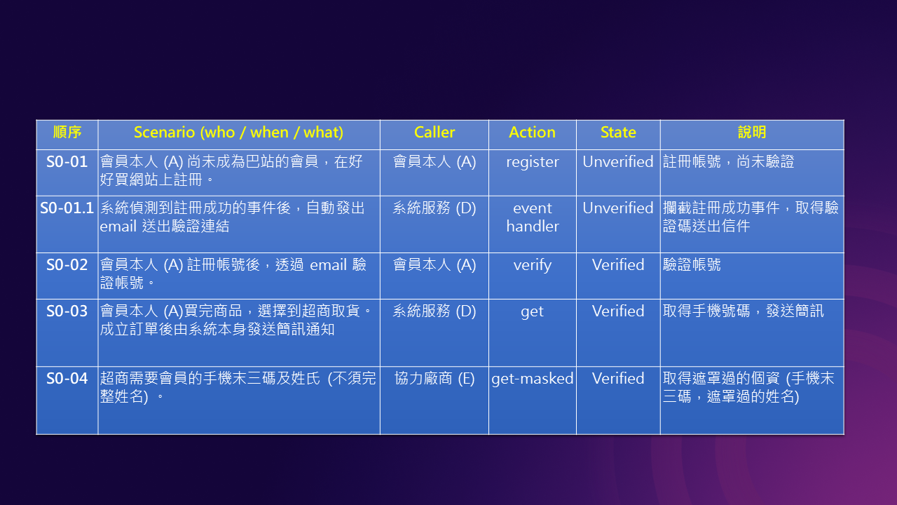 團隊裡 PO (Product Owner) 應該都能寫出這樣的 story 吧? 這串案例描述了步驟,也替每個步驟標示了 caller (誰) 做了什麼 action (操作),完成後的 state (狀態)。執行前的狀態沒有特別標示,不過這是連續動作,前一動的完成狀態就是下一動的起始狀態了。