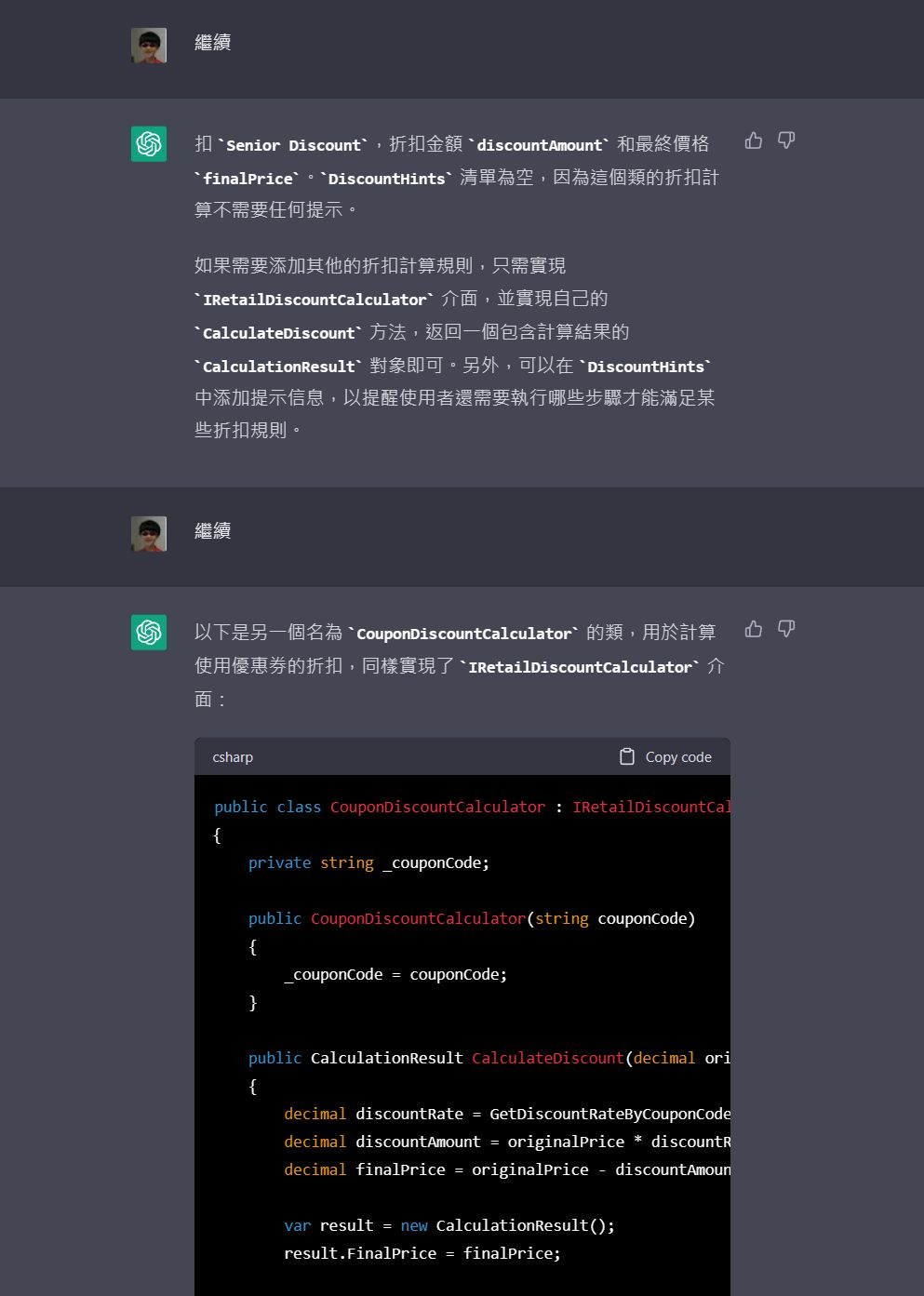整個前後文只有三句話,但是 ChatGPT 卻已經回給我我那篇文章解法的關鍵部分設計了。雖然整個 code 的設計不如我寫的精巧,但是關鍵設計結構已經出來了啊! Interface 只有一個 method, 精準的表達 input (原始價格, 我的版本是整台購物車, 這裡只是一個數字) 與 output (折扣計算的結果, 足以輸出收據明細的內容, 包含最終金額、折扣清單、以及提示清單)。