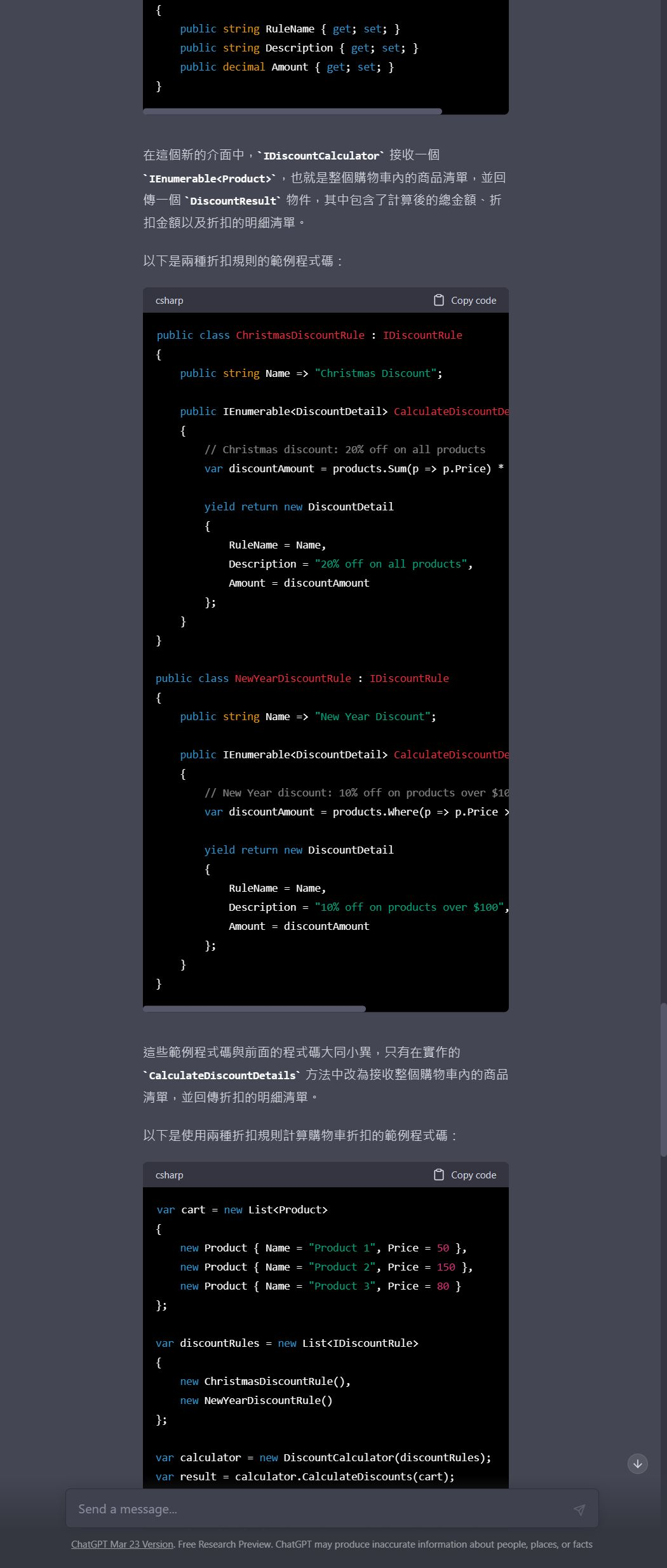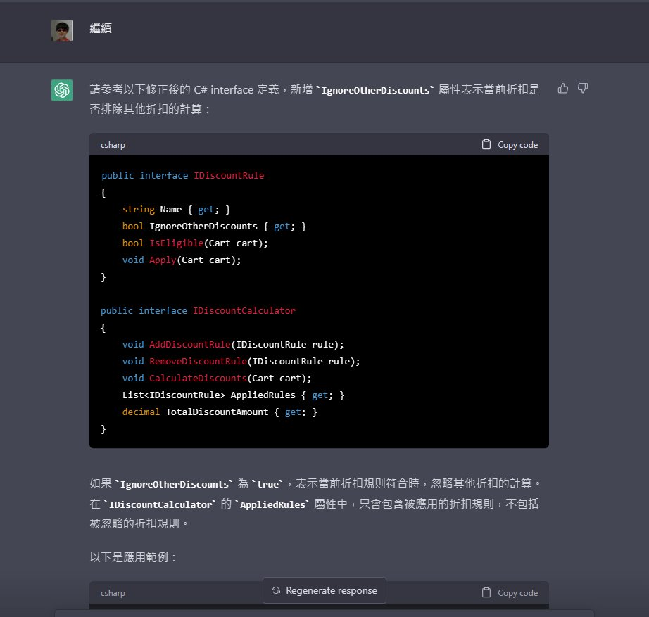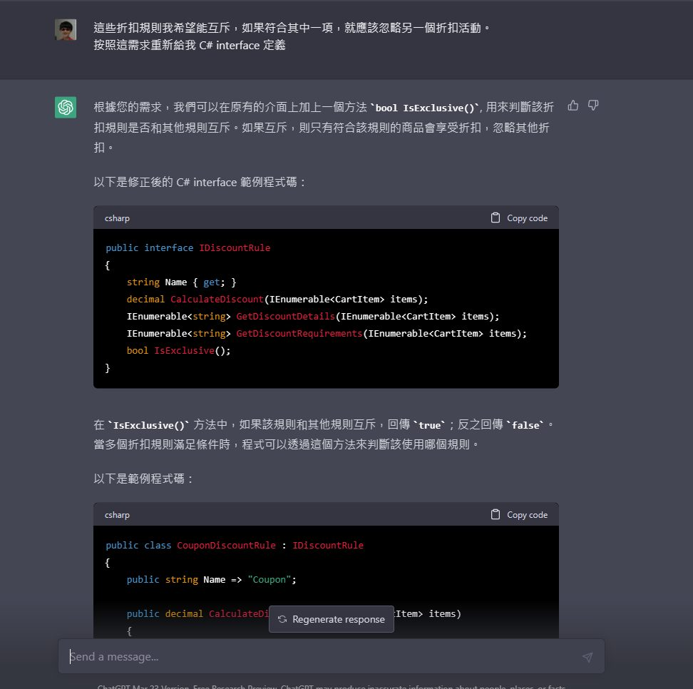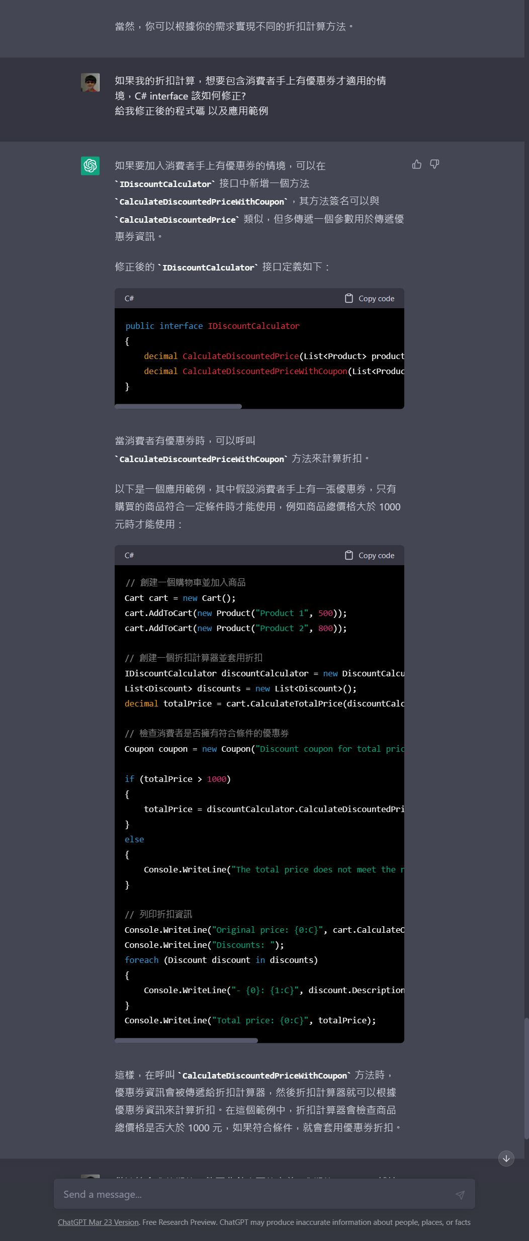 (前情提要: 我只問了兩次,短短三個要求,ChatGPT 就已經給了我折扣計算的抽象化界面 跟 同時支援兩種折扣活動的範例程式碼)