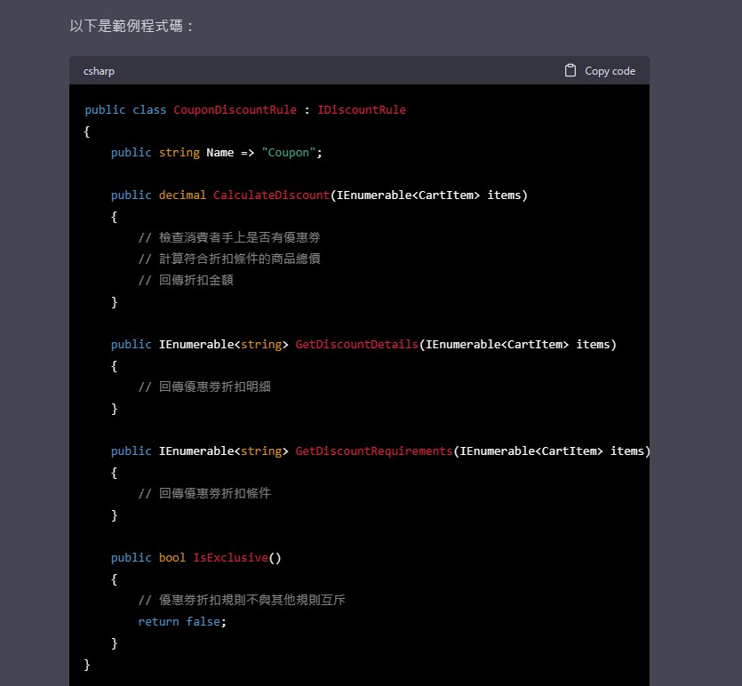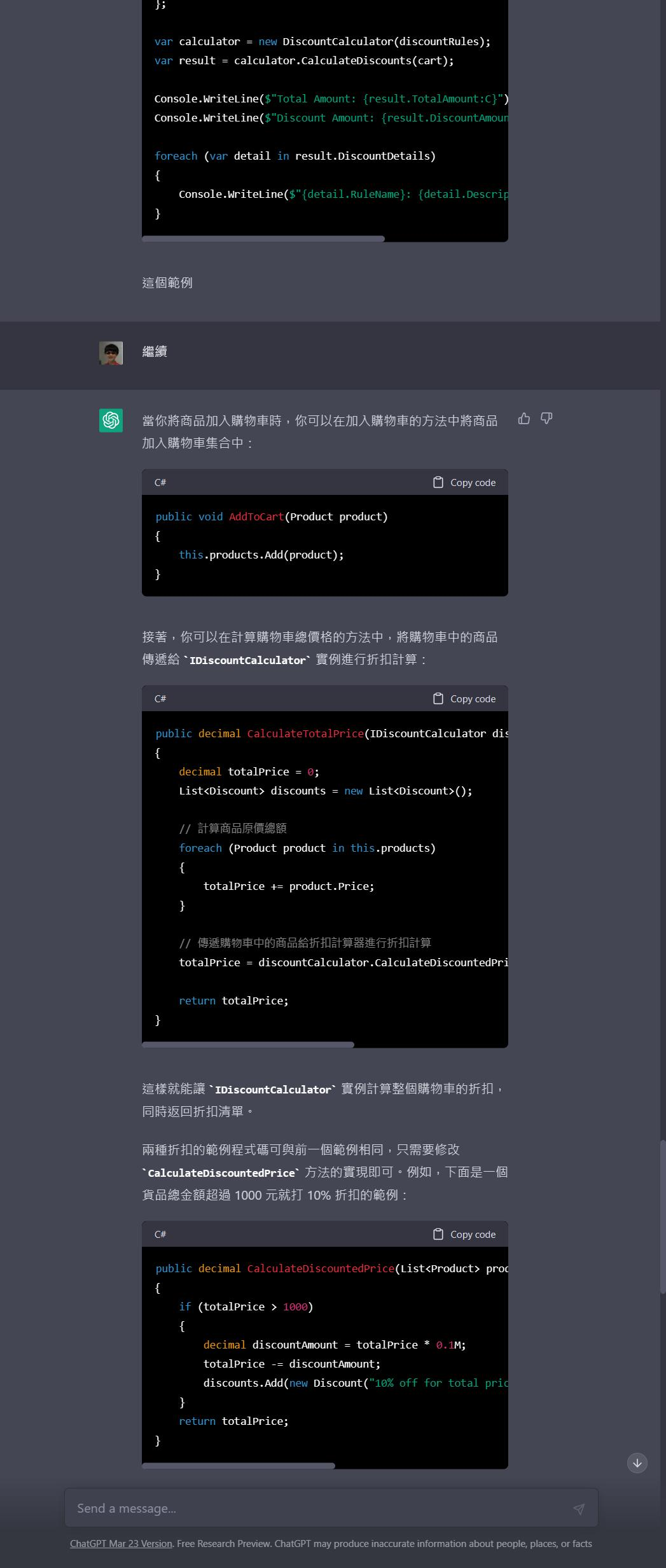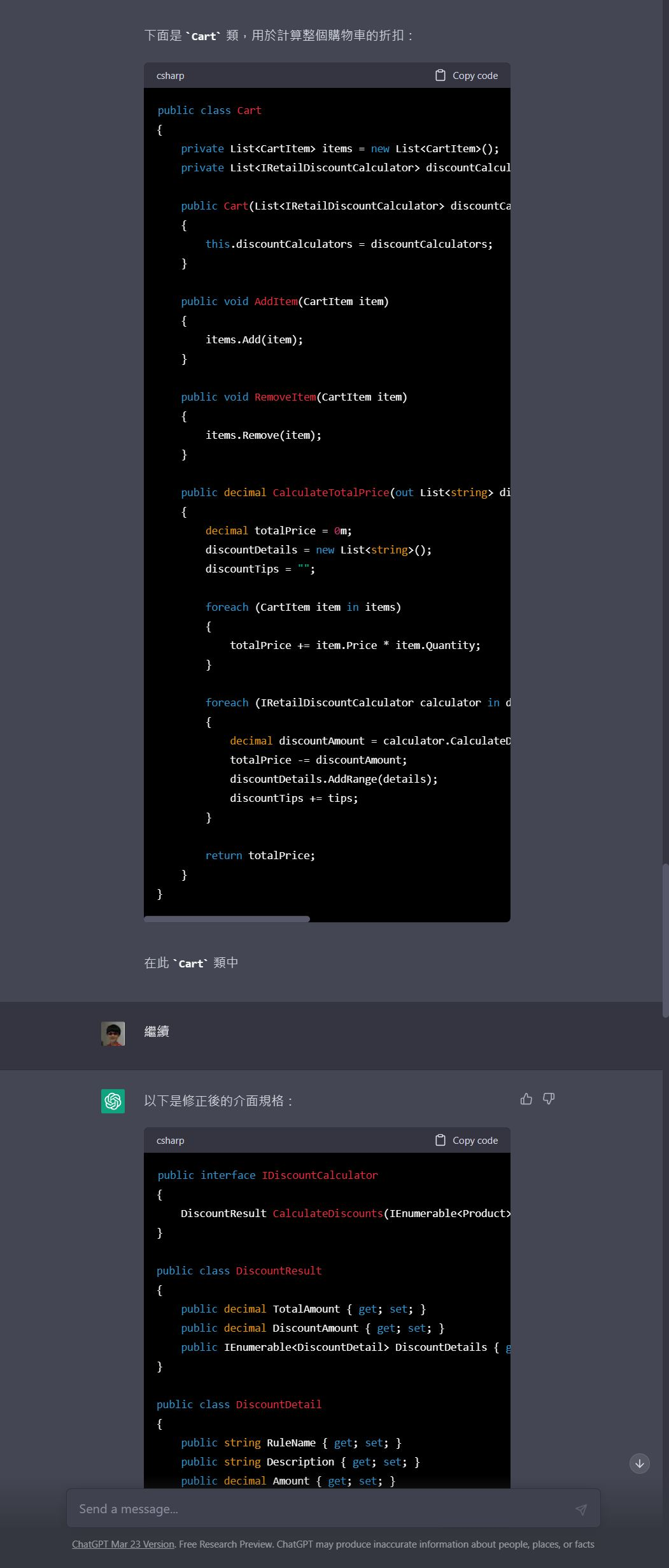 (前情提要: 我只問了兩次,短短三個要求,ChatGPT 就已經給了我折扣計算的抽象化界面 跟 同時支援兩種折扣活動的範例程式碼)