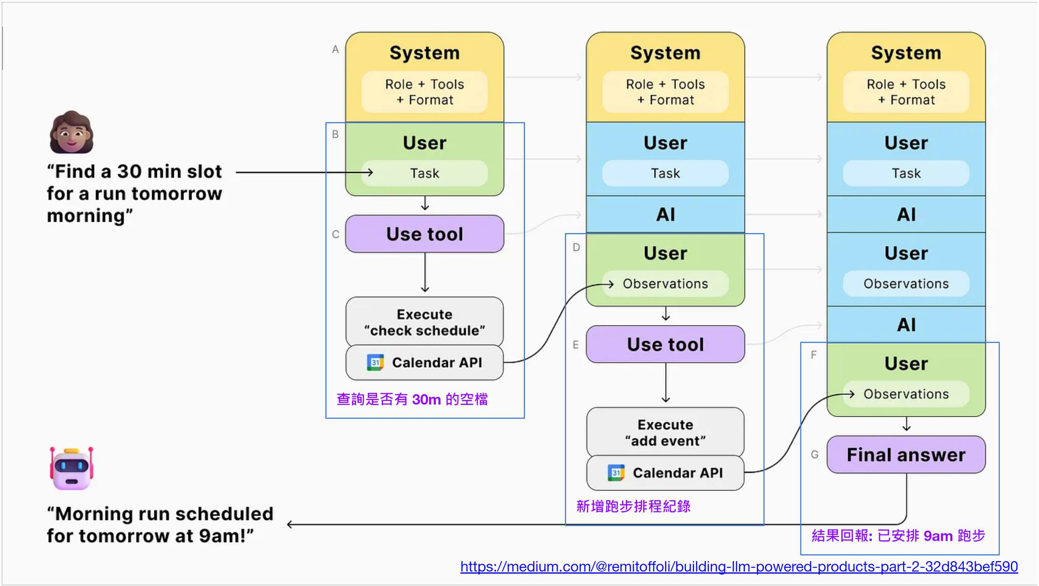 0) system: tools: [ “check_schedules”, “add_event” ] 1) user: find a 30 min slot for a run tomorrow morning