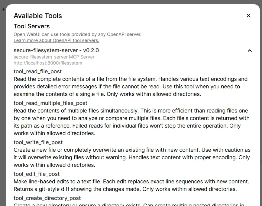 所以, mcpo 這開源專案… 你就當作方便使用的小工具就好了。如果你真的有愛不釋手的 mcp server 想把它搬到 open-webui + ollama, 那這是個好解決方案。但是, 如果你的 open-webui 要給多人同時使用, 你就要留意了, 請只使用不需要個人化的 mcp server .. ( 例如我舉例的 file system, 請勿連線到個人目錄, 或是你得替每個仁部署一套專屬的 mcp server, 並且設定成 private tool server ..)