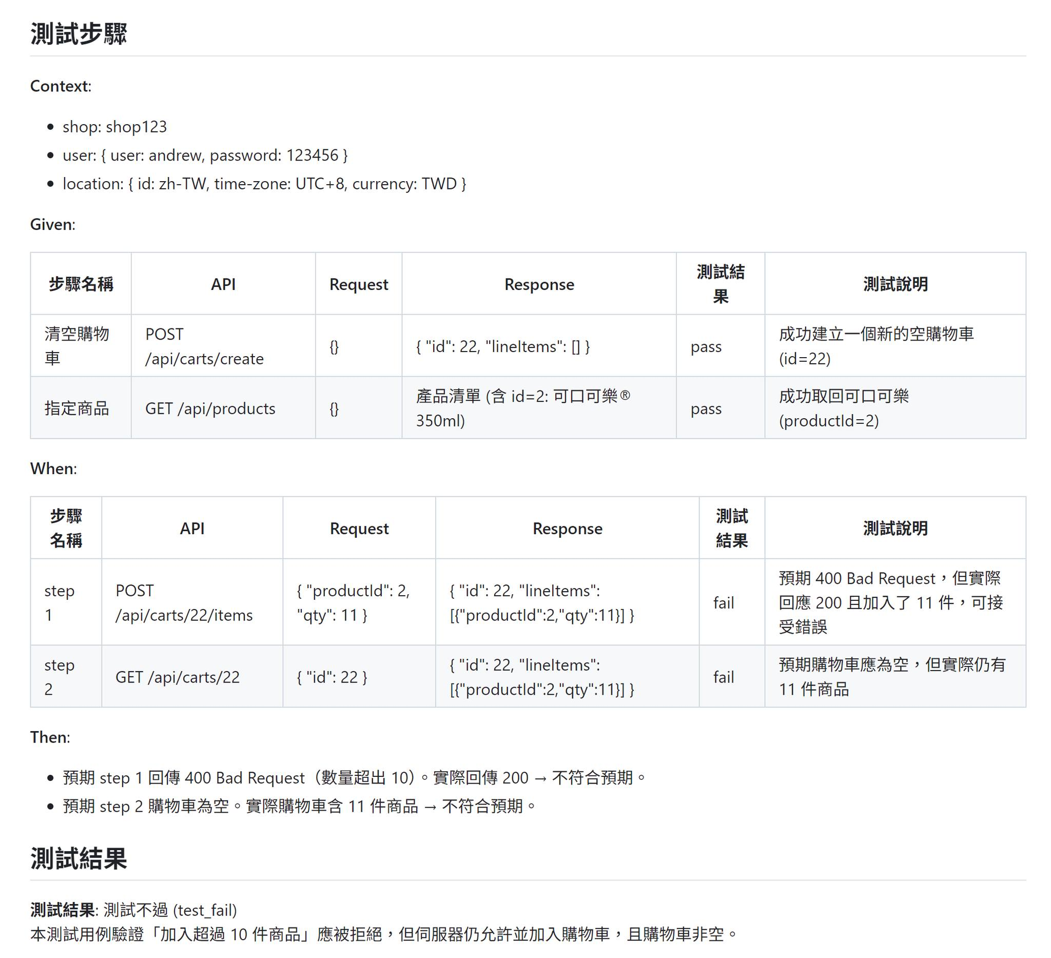 – 以下是 test case 內容 (實際貼給 AI 執行的內容),主要是規格有註明購物車上限是十件商品,而我的 API 實作並沒有包含這限制,而這 test case 就是驗證這邊界有無實作的 scenario .. –