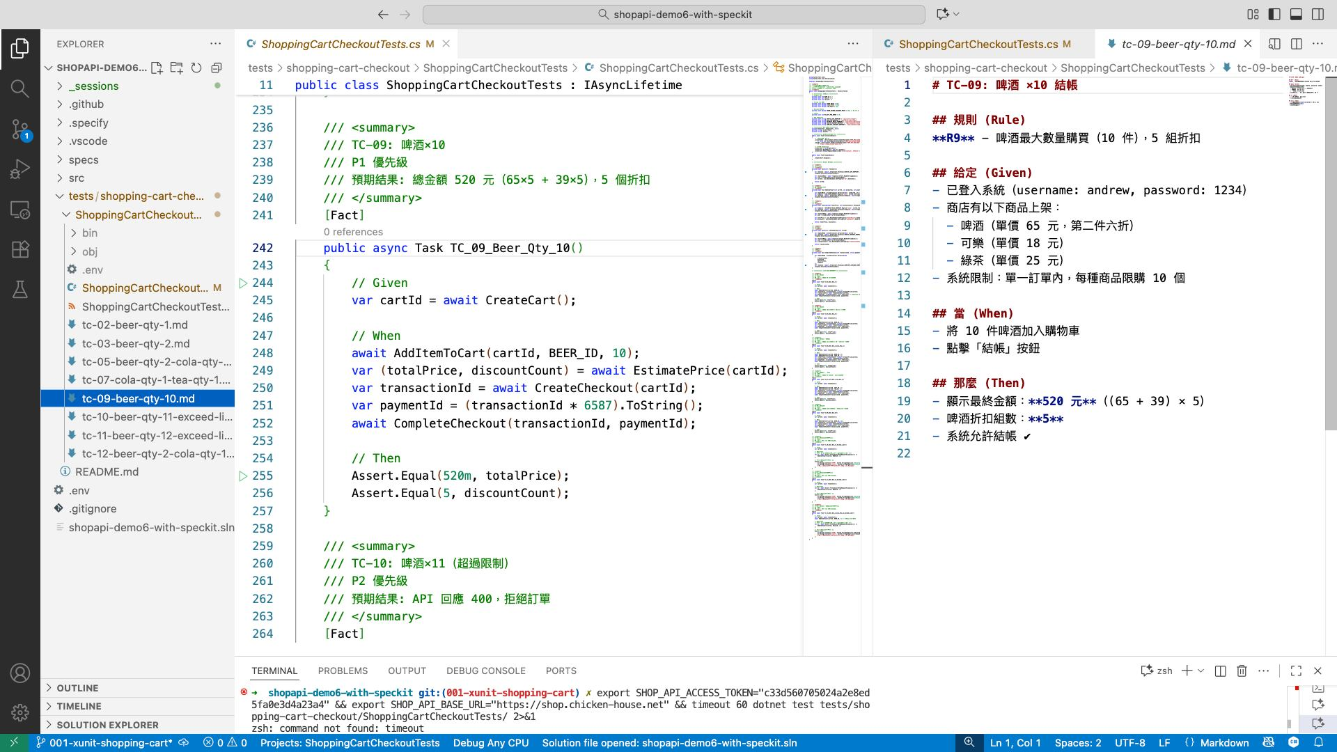 - 中: 最終透過 speckit 開發出來的 test code (c#, xunit)