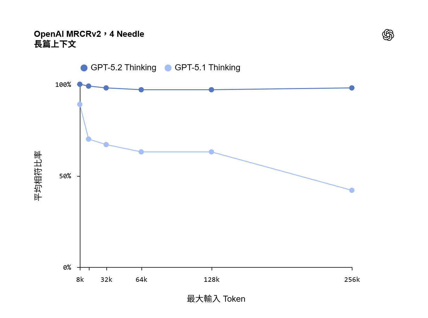 而這次 GPT5.2 的測試報告, 幾乎無視 context 的大小, 維持幾乎是滿分的 100% …, 這代表的意思是, 就算你把 context window 塞滿, GPT5.2 也能正確的把資訊抓出來